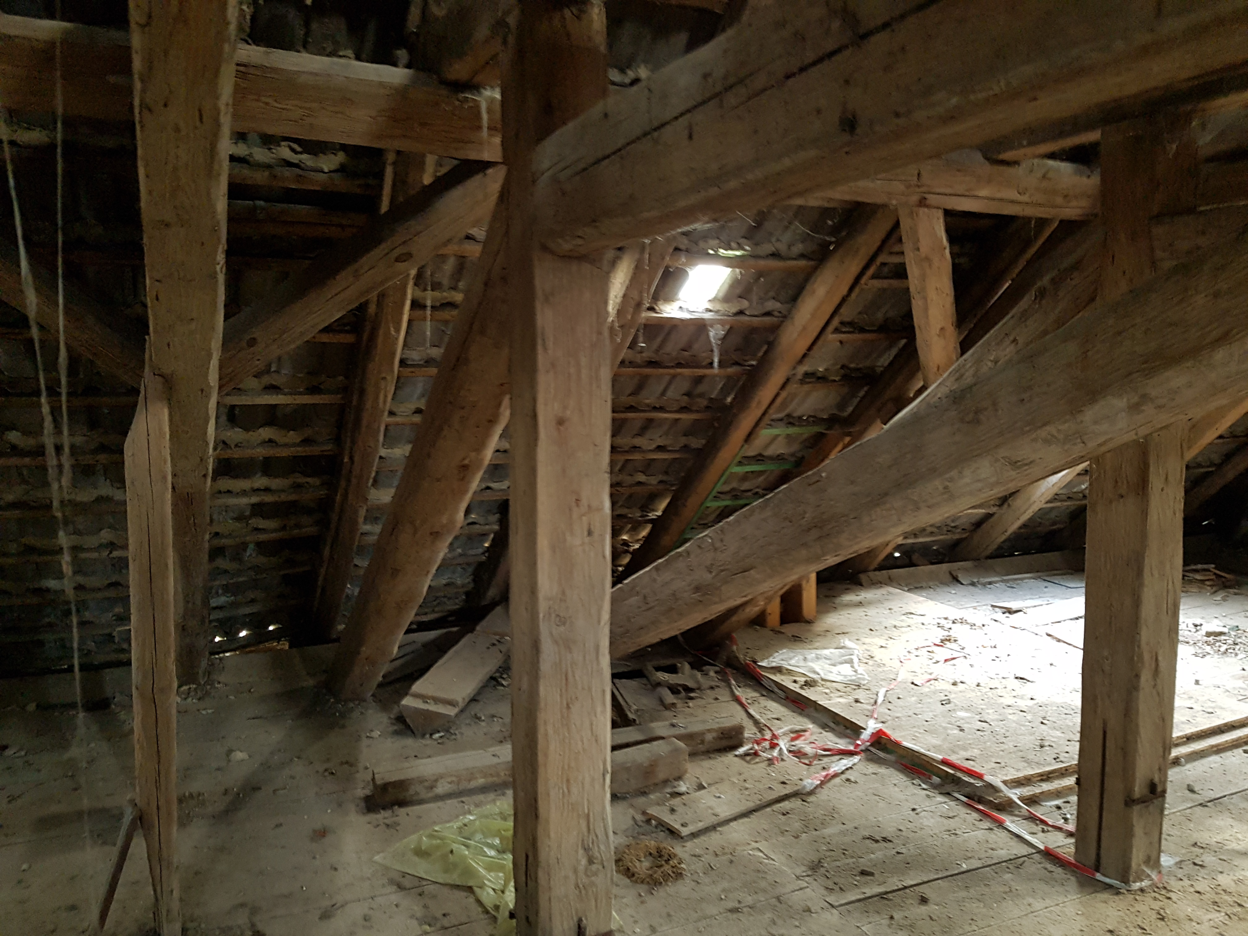 Neueindeckung des Daches mit Betonziegeln nach einem Sturmschaden jedoch ohne den zerstörten Dachreiter (Turm)